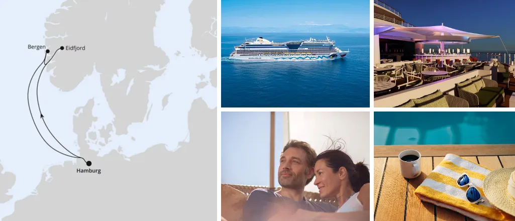 Die Route kombiniert Natur, Entspannung und Städteeindrücke in kompakter Form. Nach dem Start in Hamburg folgt zunächst ein Seetag – ideal, um das Schiff kennenzulernen und anzukommen. Danach wartet mit Eidfjord eines der landschaftlichen Highlights Norwegens: steile Felswände, ruhige Wasserflächen und Ausflugsmöglichkeiten wie der berühmte Vøringsfossen-Wasserfall.