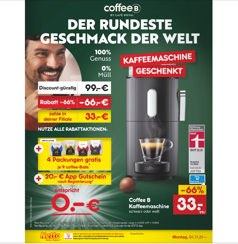 💡 Tipp: Um den 20 €-Gutschein zu erhalten, muss die Maschine nach dem Kauf auf coffeeb.com registriert werden. Der Gutschein kann dann bequem über die Netto-App eingelöst werden.