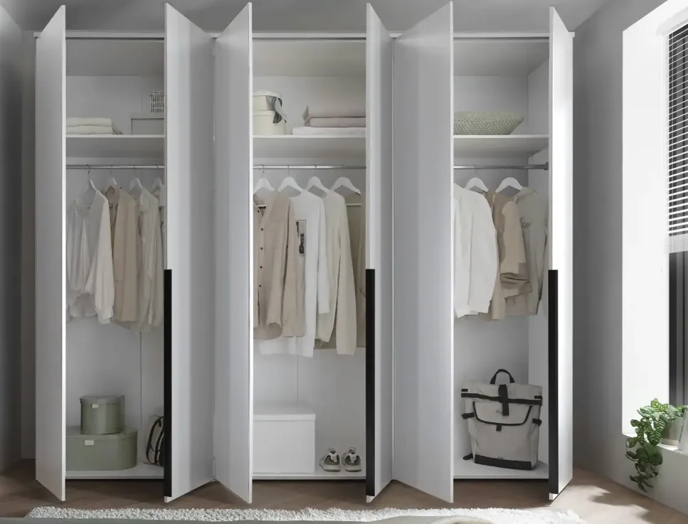 Im Inneren zeigt sich der Schrank besonders praktisch aufgebaut. Drei Kleiderstangen ermöglichen es Euch, Kleidung ordentlich aufzuhängen und nach Kategorien zu sortieren. Ergänzt wird das Ganze durch drei zusätzliche Fächer im oberen Bereich, die sich ideal für selten genutzte Stücke oder Bettwäsche eignen.