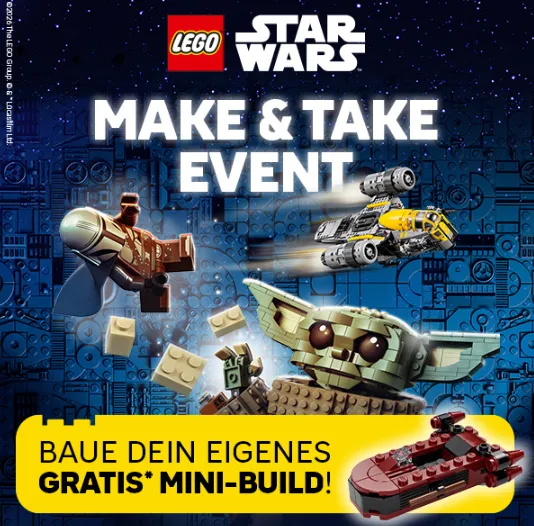 Das Prinzip ist simpel: Ihr kommt vorbei, setzt Euch an den Make & Take Tisch, baut ein kleines Modell zusammen und nehmt es direkt mit nach Hause – ohne Kaufzwang und komplett gratis. Gerade für LEGO- und Star-Wars-Fans ist das eine tolle Gelegenheit, ein kleines Sammlerstück abzustauben.