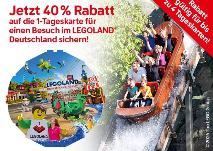 Das Angebot richtet sich an bis zu vier Personen und gilt für die Saison 2026. Ihr bestellt den Deal kostenlos, erhaltet einen Promotionscode per E-Mail und löst diesen anschließend online ein. Gerade für Familien mit Kindern ist das eine attraktive Möglichkeit, den beliebten Freizeitpark mit seinen Themenwelten, Fahrgeschäften und LEGO-Attraktionen zu erleben – und dabei spürbar zu sparen.