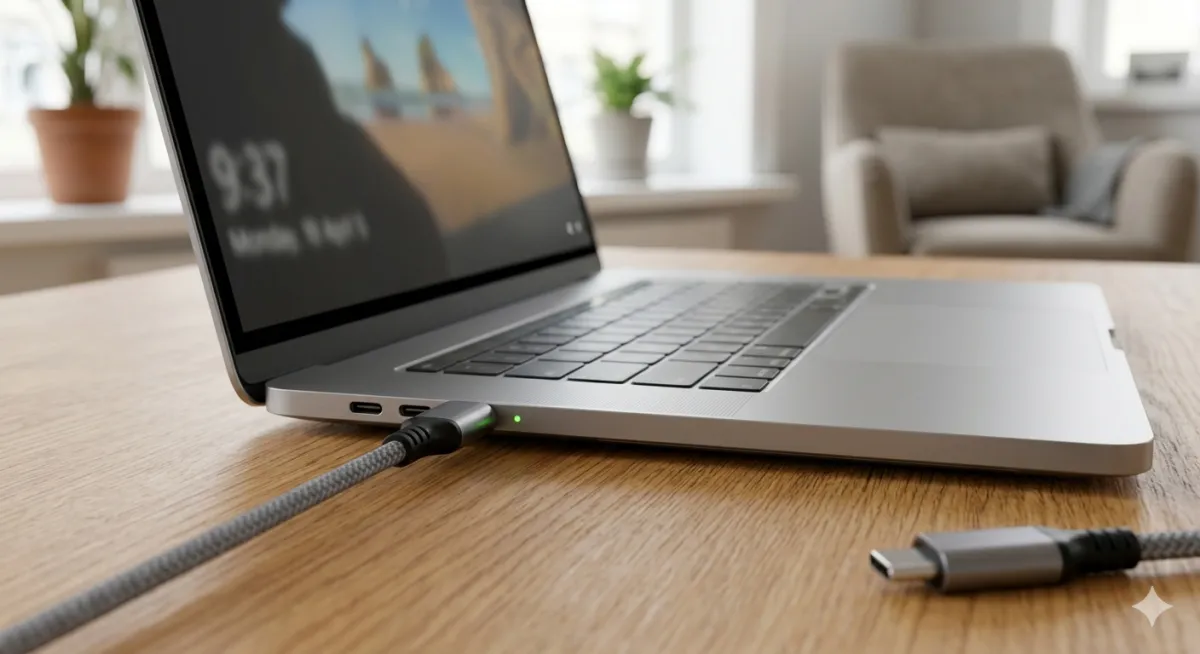 Ein modernes Notebook wird über USB-C geladen – ab 2026 wird dieser Standard in der EU verpflichtend. Bild: KI generiert (Gemini/preis-king)