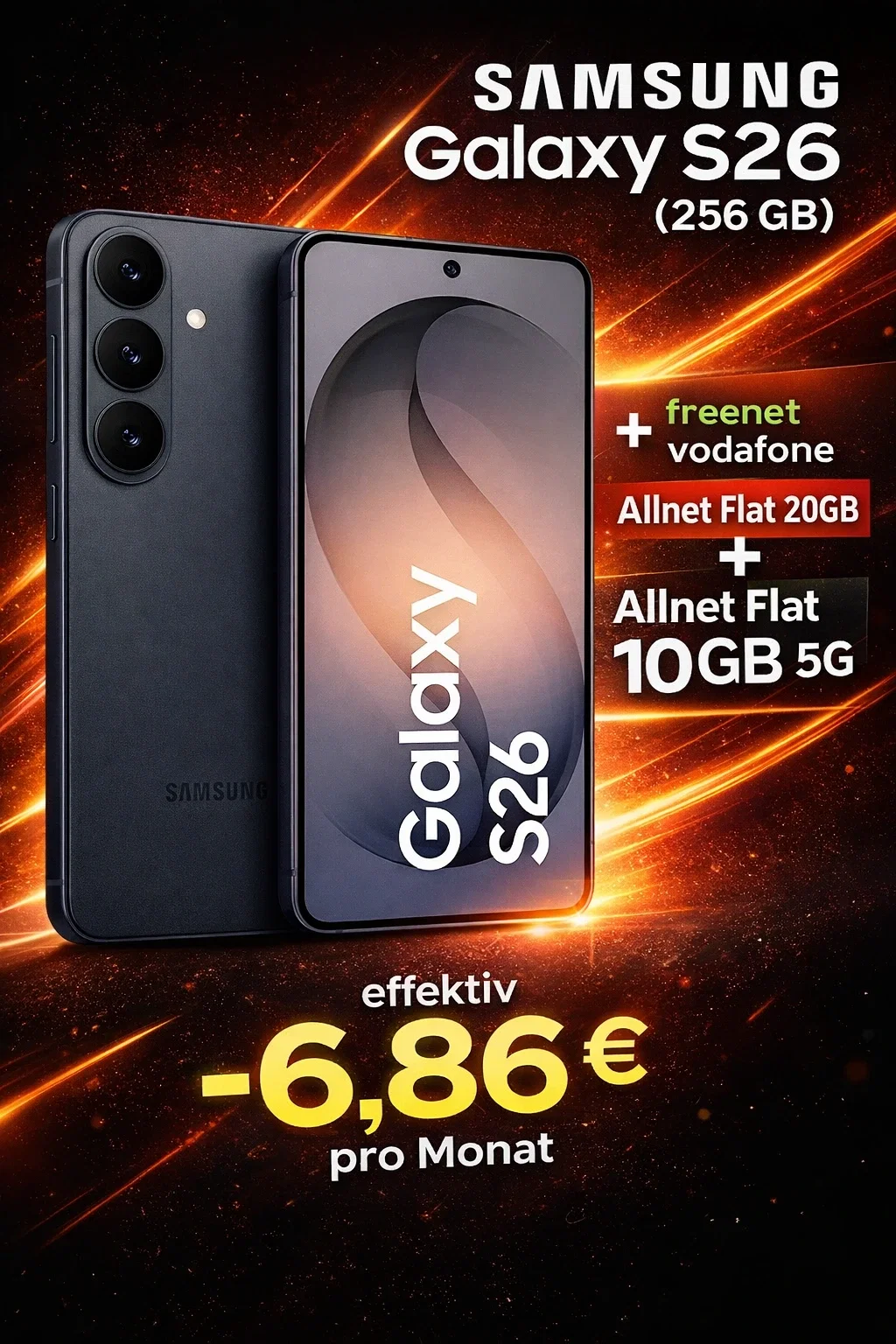 Das Samsung Galaxy S26 mit 256 GB Speicherplatz aktuell im Preisvergleich 749,00 € inkl. Versand. Damit zahlt ihr umgerechnet effektiv -6,86 € pro Monat für den Vertrag.
