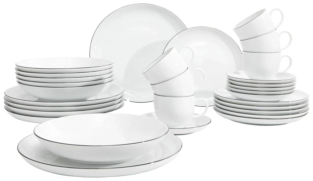 Ein harmonisch gedeckter Tisch macht oft den Unterschied zwischen Alltag und besonderem Moment. Genau hier setzt dieses 30-teilige Kombiservice mit schwarzem Rand an: Es verbindet klassische Formen mit einem modernen Kontrastdesign. Für rund sechs Personen ausgelegt, bietet das Set alles, was Ihr für ein vollständiges Menü benötigt – vom Frühstück bis zum Abendessen. Das weiße Porzellan wirkt zeitlos, während die feine schwarze Linie für einen eleganten Akzent sorgt.