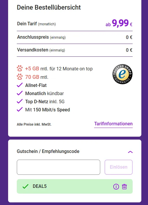 | Bonusdaten mit Gutschein | +5 GB pro Monat mit Code „DEAL5“ |