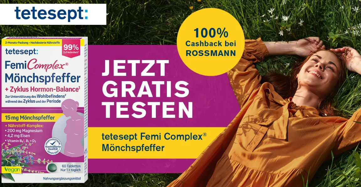 Ein kostenloses Testprodukt ist immer dann spannend, wenn die Teilnahme klar geregelt ist und Ihr am Ende nicht lange nach den Bedingungen suchen müsst. Genau darum geht es bei dieser tetesept Femi Complex Cashback-Aktion: Ihr kauft das Aktionsprodukt bei Rossmann, ladet anschließend den Kassenbon hoch und bekommt nach erfolgreicher Prüfung den Kaufpreis zurückerstattet. Die maximale Erstattung liegt bei 4,99 Euro.