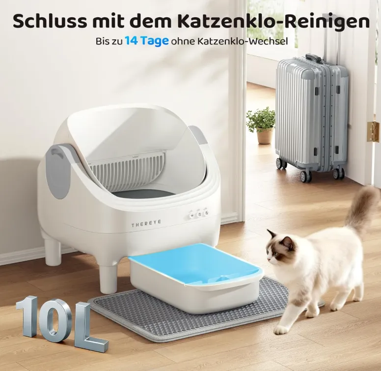 Dieses Modell von Thereye kombiniert ein offenes Design mit intelligenter Technik. Besonders praktisch ist die Steuerung per App, mit der Ihr die Nutzung und Reinigung im Blick behaltet. Mit einem aktuellen Preis von 120,69 € statt 170 € gehört dieses Modell zu den interessanteren Deals im Bereich smarter Katzenklos. Die Bewertung von 4,0 von 5 Sternen bei 62 Rezensionen zeigt, dass viele Nutzer bereits gute Erfahrungen gemacht haben – gerade bei Haushalten mit mehreren Katzen.