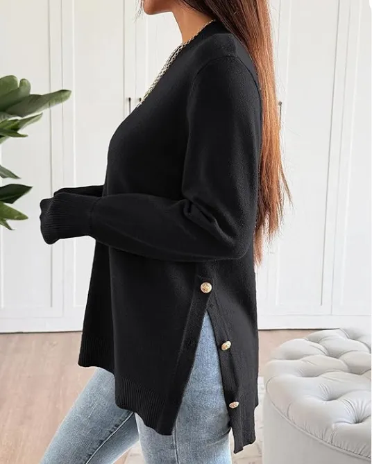 - Design: Rundhalsausschnitt mit einfarbigem Look und dekorativen Knöpfen an der Seite